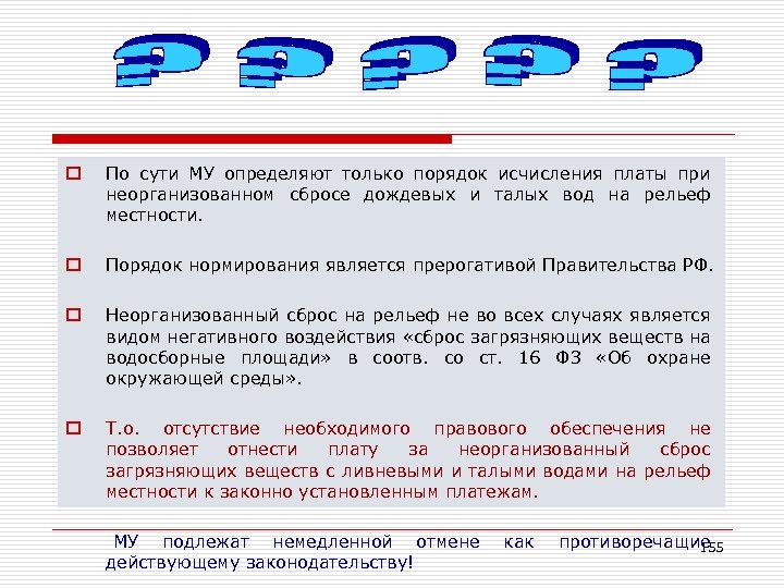 o По сути МУ определяют только порядок исчисления платы при неорганизованном сбросе дождевых и талых вод на рельеф местности. o Порядок нормирования является прерогативой Правительства РФ. o Неорганизованный сброс на рельеф не во всех случаях является видом негативного воздействия «сброс загрязняющих веществ на водосборные площади» в соотв. со ст. 16 ФЗ «Об охране окружающей среды» . o Т. о. отсутствие необходимого правового обеспечения не позволяет отнести плату за неорганизованный сброс загрязняющих веществ с ливневыми и талыми водами на рельеф местности к законно установленным платежам. МУ подлежат немедленной отмене действующему законодательству! как противоречащие 155