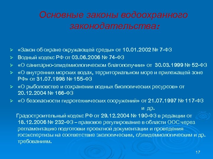 Основные законы водоохранного законодательства: Ø Ø Ø «Закон об охране окружающей среды» от 10. 01. 2002 № 7 -ФЗ Водный кодекс РФ от 03. 06. 2006 № 74 -ФЗ «О санитарно-эпидемиологическом благополучии» от 30. 03. 1999 № 52 -ФЗ «О внутренних морских водах, территориальном море и прилежащей зоне РФ» от 31. 07. 1998 № 155 -ФЗ «О рыболовстве и сохранении водных биологических ресурсов» от 20. 12. 2004 № 166 -ФЗ «О безопасности гидротехнических сооружений» от 21. 07. 1997 № 117 -ФЗ и др. Градостроительный кодекс РФ от 29. 12. 2004 № 190 -ФЗ в редакции от 18. 12. 2006 № 232 -ФЗ – правовое регулирование в области ООС через регламентацию подготовки проектной документации и проведения госэкспертизы на соответствие экологическим, с/эпидемиологическим и др. требованиям. 17