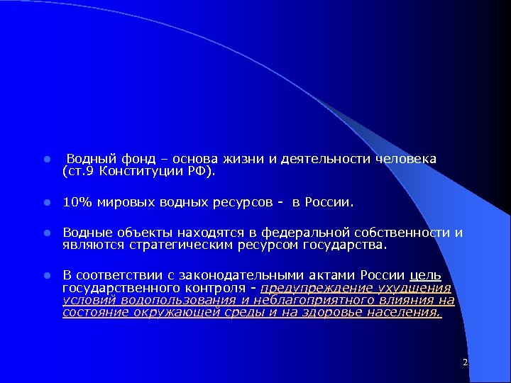 l Водный фонд – основа жизни и деятельности человека (ст. 9 Конституции РФ). l 10% мировых водных ресурсов - в России. l Водные объекты находятся в федеральной собственности и являются стратегическим ресурсом государства. l В соответствии с законодательными актами России цель государственного контроля - предупреждение ухудшения условий водопользования и неблагоприятного влияния на состояние окружающей среды и на здоровье населения. 2