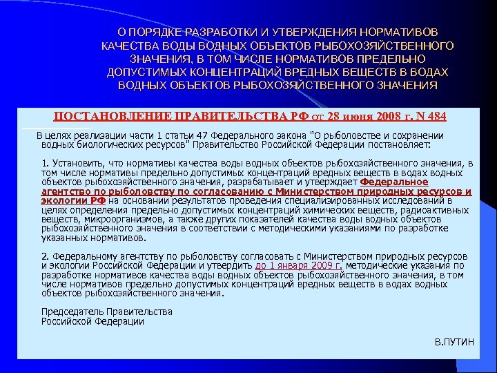 О ПОРЯДКЕ РАЗРАБОТКИ И УТВЕРЖДЕНИЯ НОРМАТИВОВ КАЧЕСТВА ВОДЫ ВОДНЫХ ОБЪЕКТОВ РЫБОХОЗЯЙСТВЕННОГО ЗНАЧЕНИЯ, В ТОМ ЧИСЛЕ НОРМАТИВОВ ПРЕДЕЛЬНО ДОПУСТИМЫХ КОНЦЕНТРАЦИЙ ВРЕДНЫХ ВЕЩЕСТВ В ВОДАХ ВОДНЫХ ОБЪЕКТОВ РЫБОХОЗЯЙСТВЕННОГО ЗНАЧЕНИЯ ПОСТАНОВЛЕНИЕ ПРАВИТЕЛЬСТВА РФ от 28 июня 2008 г. N 484 В целях реализации части 1 статьи 47 Федерального закона "О рыболовстве и сохранении водных биологических ресурсов" Правительство Российской Федерации постановляет: 1. Установить, что нормативы качества воды водных объектов рыбохозяйственного значения, в том числе нормативы предельно допустимых концентраций вредных веществ в водах водных объектов рыбохозяйственного значения, разрабатывает и утверждает Федеральное агентство по рыболовству по согласованию с Министерством природных ресурсов и экологии РФ на основании результатов проведения специализированных исследований в целях определения предельно допустимых концентраций химических веществ, радиоактивных веществ, микроорганизмов, а также других показателей качества воды водных объектов рыбохозяйственного значения в соответствии с методическими указаниями по разработке указанных нормативов. 2. Федеральному агентству по рыболовству согласовать с Министерством природных ресурсов и экологии Российской Федерации и утвердить до 1 января 2009 г. методические указания по разработке нормативов качества воды водных объектов рыбохозяйственного значения, в том числе нормативов предельно допустимых концентраций вредных веществ в водах водных объектов рыбохозяйственного значения. Председатель Правительства Российской Федерации В. ПУТИН 20