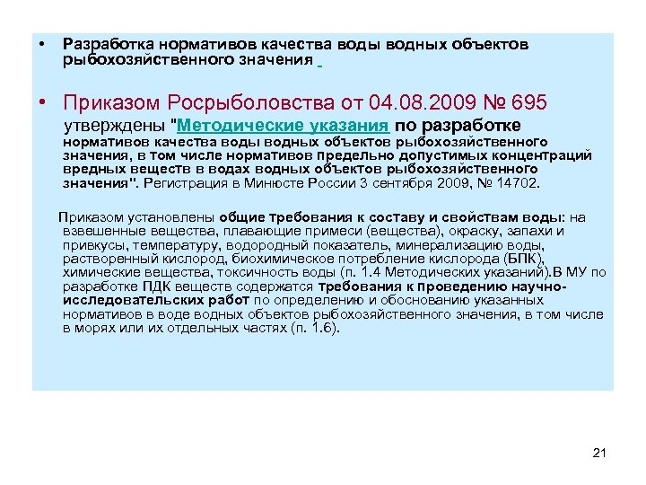 • Разработка нормативов качества воды водных объектов рыбохозяйственного значения • Приказом Росрыболовства от 04. 08. 2009 № 695 утверждены "Методические указания по разработке нормативов качества воды водных объектов рыбохозяйственного значения, в том числе нормативов предельно допустимых концентраций вредных веществ в водах водных объектов рыбохозяйственного значения". Регистрация в Минюсте России 3 сентября 2009, № 14702. Приказом установлены общие требования к составу и свойствам воды: на взвешенные вещества, плавающие примеси (вещества), окраску, запахи и привкусы, температуру, водородный показатель, минерализацию воды, растворенный кислород, биохимическое потребление кислорода (БПК), химические вещества, токсичность воды (п. 1. 4 Методических указаний). В МУ по разработке ПДК веществ содержатся требования к проведению научноисследовательских работ по определению и обоснованию указанных нормативов в воде водных объектов рыбохозяйственного значения, в том числе в морях или их отдельных частях (п. 1. 6). 21