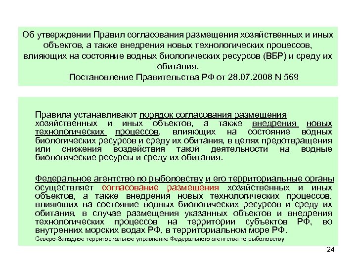 Об утверждении Правил согласования размещения хозяйственных и иных объектов, а также внедрения новых технологических процессов, влияющих на состояние водных биологических ресурсов (ВБР) и среду их обитания. Постановление Правительства РФ от 28. 07. 2008 N 569 Правила устанавливают порядок согласования размещения хозяйственных и иных объектов, а также внедрения новых технологических процессов, влияющих на состояние водных биологических ресурсов и среду их обитания, в целях предотвращения или снижения воздействия такой деятельности на водные биологические ресурсы и среду их обитания. Федеральное агентство по рыболовству и его территориальные органы осуществляет согласование размещения хозяйственных и иных объектов, а также внедрения новых технологических процессов, влияющих на состояние водных биологических ресурсов и среду их обитания, в случае размещения указанных объектов и внедрения технологических процессов на территории субъектов РФ, во внутренних морских водах РФ, в территориальном море РФ. Северо-Западное территориальное управление Федерального агентства по рыболовству 24
