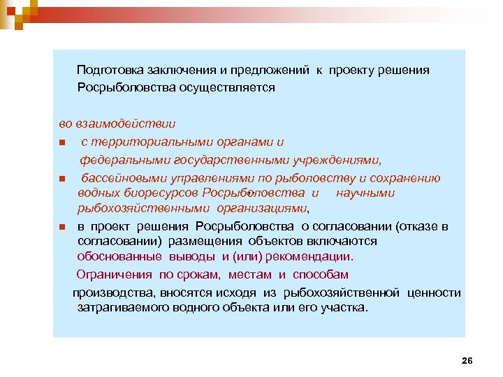 Подготовка заключения и предложений к проекту решения Росрыболовства осуществляется во взаимодействии n с территориальными органами и федеральными государственными учреждениями, n бассейновыми управлениями по рыболовству и сохранению , . водных биоресурсов Росрыболовства и научными рыбохозяйственными организациями, n в проект решения Росрыболовства о согласовании (отказе в согласовании) размещения объектов включаются обоснованные выводы и (или) рекомендации. Ограничения по срокам, местам и способам производства, вносятся исходя из рыбохозяйственной ценности затрагиваемого водного объекта или его участка. 26