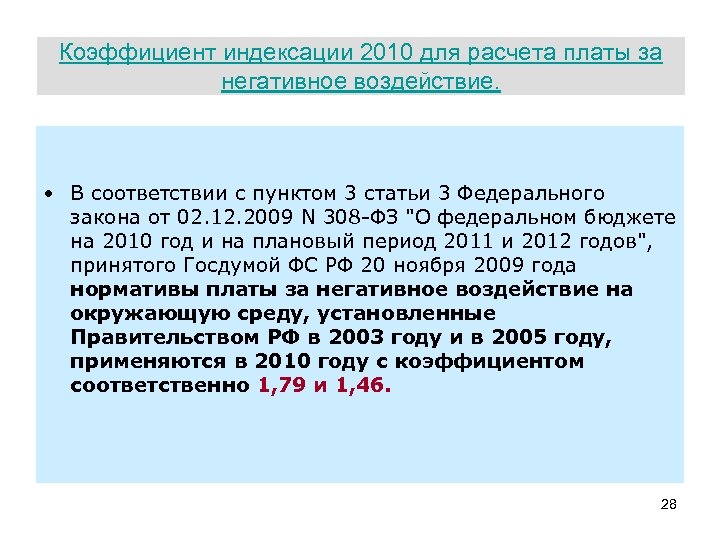 Коэффициент индексации 2010 для расчета платы за негативное воздействие. • В соответствии с пунктом 3 статьи 3 Федерального закона от 02. 12. 2009 N 308 -ФЗ "О федеральном бюджете на 2010 год и на плановый период 2011 и 2012 годов", принятого Госдумой ФС РФ 20 ноября 2009 года нормативы платы за негативное воздействие на окружающую среду, установленные Правительством РФ в 2003 году и в 2005 году, применяются в 2010 году с коэффициентом соответственно 1, 79 и 1, 46. 28