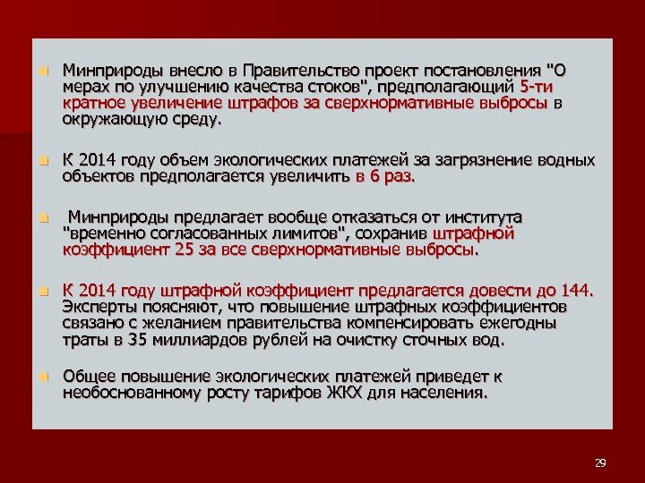 n Минприроды внесло в Правительство проект постановления "О мерах по улучшению качества стоков", предполагающий 5 -ти кратное увеличение штрафов за сверхнормативные выбросы в окружающую среду. n К 2014 году объем экологических платежей за загрязнение водных объектов предполагается увеличить в 6 раз. n Минприроды предлагает вообще отказаться от института "временно согласованных лимитов", сохранив штрафной коэффициент 25 за все сверхнормативные выбросы. n К 2014 году штрафной коэффициент предлагается довести до 144. Эксперты поясняют, что повышение штрафных коэффициентов связано с желанием правительства компенсировать ежегодны траты в 35 миллиардов рублей на очистку сточных вод. n Общее повышение экологических платежей приведет к необоснованному росту тарифов ЖКХ для населения. 29