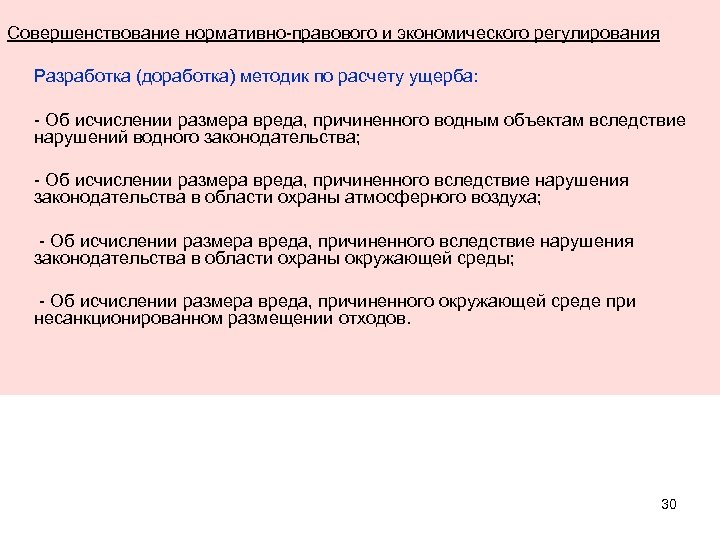 Совершенствование нормативно-правового и экономического регулирования Разработка (доработка) методик по расчету ущерба: - Об исчислении размера вреда, причиненного водным объектам вследствие нарушений водного законодательства; - Об исчислении размера вреда, причиненного вследствие нарушения законодательства в области охраны атмосферного воздуха; - Об исчислении размера вреда, причиненного вследствие нарушения законодательства в области охраны окружающей среды; - Об исчислении размера вреда, причиненного окружающей среде при несанкционированном размещении отходов. 30