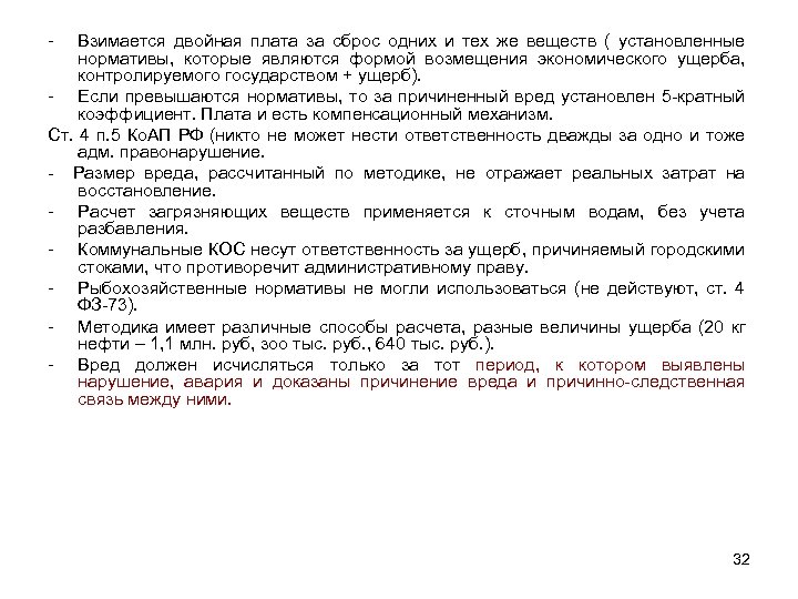 - Взимается двойная плата за сброс одних и тех же веществ ( установленные нормативы, которые являются формой возмещения экономического ущерба, контролируемого государством + ущерб). - Если превышаются нормативы, то за причиненный вред установлен 5 -кратный коэффициент. Плата и есть компенсационный механизм. Ст. 4 п. 5 Ко. АП РФ (никто не может нести ответственность дважды за одно и тоже адм. правонарушение. - Размер вреда, рассчитанный по методике, не отражает реальных затрат на восстановление. - Расчет загрязняющих веществ применяется к сточным водам, без учета разбавления. - Коммунальные КОС несут ответственность за ущерб, причиняемый городскими стоками, что противоречит административному праву. - Рыбохозяйственные нормативы не могли использоваться (не действуют, ст. 4 ФЗ-73). - Методика имеет различные способы расчета, разные величины ущерба (20 кг нефти – 1, 1 млн. руб, зоо тыс. руб. , 640 тыс. руб. ). - Вред должен исчисляться только за тот период, к котором выявлены нарушение, авария и доказаны причинение вреда и причинно-следственная связь между ними. 32