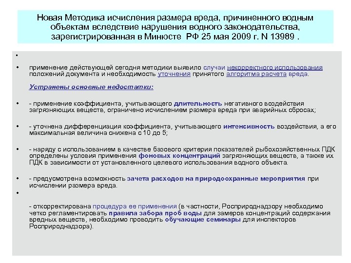Новая Методика исчисления размера вреда, причиненного водным объектам вследствие нарушения водного законодательства, зарегистрированная в Минюсте РФ 25 мая 2009 г. N 13989. • • применение действующей сегодня методики выявило случаи некорректного использования положений документа и необходимость уточнения принятого алгоритма расчета вреда. Устранены основные недостатки: • - применение коэффициента, учитывающего длительность негативного воздействия загрязняющих веществ, ограничено исчислением размера вреда при аварийных сбросах; • - уточнена дифференциация коэффициента, учитывающего интенсивность воздействия, а его максимальная величина снижена с 10 до 5; • - наряду с использованием в качестве базового критерия показателей рыбохозяйственных ПДК определены условия применения фоновых концентраций загрязняющих веществ, а также их ПДК в зависимости от установленного целевого использования водного объекта. • - предусмотрена возможность зачета расходов на природоохранные мероприятия при исчислении размера вреда. • - откорректирована процедура ее применения (в частности, Росприроднадзору необходимо четко регламентировать правила забора проб воды для замеров концентраций содержания вредных веществ, необходимо проводить обучающие семинары для инспекторов Росприроднадзора). 34