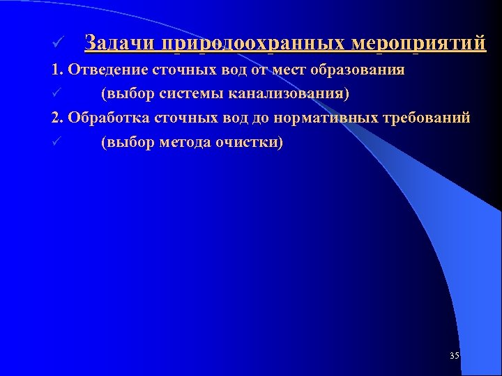 ü Задачи природоохранных мероприятий 1. Отведение сточных вод от мест образования ü (выбор системы канализования) 2. Обработка сточных вод до нормативных требований ü (выбор метода очистки) 35