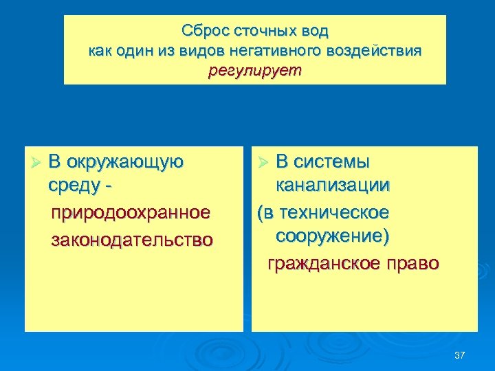 Сброс сточных вод как один из видов негативного воздействия регулирует В окружающую среду природоохранное законодательство Ø В системы канализации (в техническое сооружение) гражданское право Ø 37