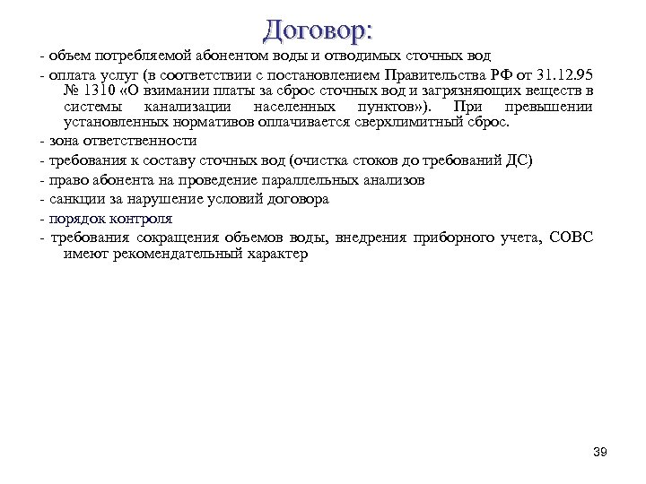 Договор: - объем потребляемой абонентом воды и отводимых сточных вод - оплата услуг (в соответствии с постановлением Правительства РФ от 31. 12. 95 № 1310 «О взимании платы за сброс сточных вод и загрязняющих веществ в системы канализации населенных пунктов» ). При превышении установленных нормативов оплачивается сверхлимитный сброс. - зона ответственности - требования к составу сточных вод (очистка стоков до требований ДС) - право абонента на проведение параллельных анализов - санкции за нарушение условий договора - порядок контроля - требования сокращения объемов воды, внедрения приборного учета, СОВС имеют рекомендательный характер 39
