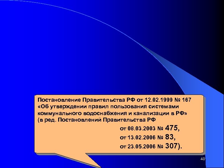 Постановление Правительства РФ от 12. 02. 1999 № 167 «Об утверждении правил пользования системами коммунального водоснабжения и канализации в РФ» (в ред. Постановлений Правительства РФ от 08. 03. 2003 № 475, от 13. 02. 2006 № 83, от 23. 05. 2006 № 307). 40