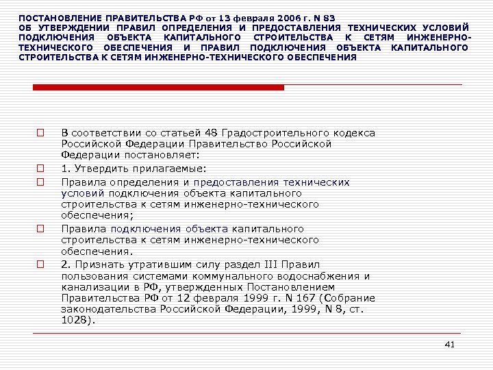 ПОСТАНОВЛЕНИЕ ПРАВИТЕЛЬСТВА РФ от 13 февраля 2006 г. N 83 ОБ УТВЕРЖДЕНИИ ПРАВИЛ ОПРЕДЕЛЕНИЯ И ПРЕДОСТАВЛЕНИЯ ТЕХНИЧЕСКИХ УСЛОВИЙ ПОДКЛЮЧЕНИЯ ОБЪЕКТА КАПИТАЛЬНОГО СТРОИТЕЛЬСТВА К СЕТЯМ ИНЖЕНЕРНОТЕХНИЧЕСКОГО ОБЕСПЕЧЕНИЯ И ПРАВИЛ ПОДКЛЮЧЕНИЯ ОБЪЕКТА КАПИТАЛЬНОГО СТРОИТЕЛЬСТВА К СЕТЯМ ИНЖЕНЕРНО-ТЕХНИЧЕСКОГО ОБЕСПЕЧЕНИЯ o o o В соответствии со статьей 48 Градостроительного кодекса Российской Федерации Правительство Российской Федерации постановляет: 1. Утвердить прилагаемые: Правила определения и предоставления технических условий подключения объекта капитального строительства к сетям инженерно-технического обеспечения; Правила подключения объекта капитального строительства к сетям инженерно-технического обеспечения. 2. Признать утратившим силу раздел III Правил пользования системами коммунального водоснабжения и канализации в РФ, утвержденных Постановлением Правительства РФ от 12 февраля 1999 г. N 167 (Собрание законодательства Российской Федерации, 1999, N 8, ст. 1028). 41