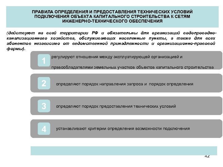 ПРАВИЛА ОПРЕДЕЛЕНИЯ И ПРЕДОСТАВЛЕНИЯ ТЕХНИЧЕСКИХ УСЛОВИЙ ПОДКЛЮЧЕНИЯ ОБЪЕКТА КАПИТАЛЬНОГО СТРОИТЕЛЬСТВА К СЕТЯМ ИНЖЕНЕРНО-ТЕХНИЧЕСКОГО ОБЕСПЕЧЕНИЯ (действуют на всей территории РФ и обязательны для организаций водопроводноканализационного хозяйства, обслуживающих населенные пункты, а также для всех абонентов независимо от ведомственной принадлежности и организационно-правовой формы). 1 регулируют отношения между эксплуатирующей организацией и правообладателями земельных участков объектов капитального строительства 2 определяют порядок направления запроса и порядок определения 3 определяют порядок предоставления технических условий 4 устанавливают критерии определения возможности подключения 42