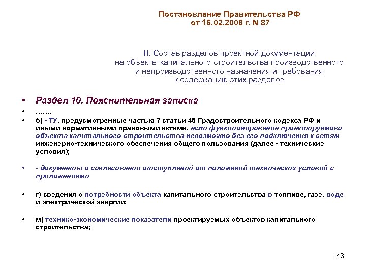 Постановление Правительства РФ от 16. 02. 2008 г. N 87 II. Состав разделов проектной документации на объекты капитального строительства производственного и непроизводственного назначения и требования к содержанию этих разделов • Раздел 10. Пояснительная записка • • ……. б) - ТУ, предусмотренные частью 7 статьи 48 Градостроительного кодекса РФ и иными нормативными правовыми актами, если функционирование проектируемого объекта капитального строительства невозможно без его подключения к сетям инженерно-технического обеспечения общего пользования (далее - технические условия); • - документы о согласовании отступлений от положений технических условий с приложениями • г) сведения о потребности объекта капитального строительства в топливе, газе, воде и электрической энергии; • м) технико-экономические показатели проектируемых объектов капитального строительства; 43