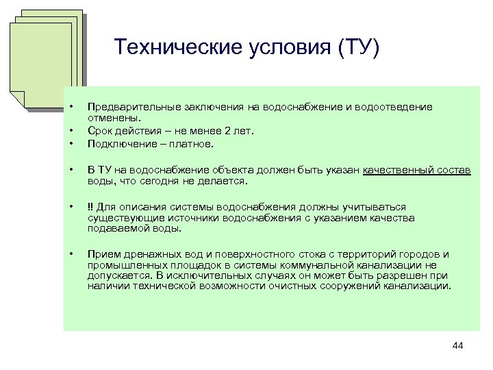 Технические условия (ТУ) • • • Предварительные заключения на водоснабжение и водоотведение отменены. Срок действия – не менее 2 лет. Подключение – платное. • В ТУ на водоснабжение объекта должен быть указан качественный состав воды, что сегодня не делается. • !! Для описания системы водоснабжения должны учитываться существующие источники водоснабжения с указанием качества подаваемой воды. • Прием дренажных вод и поверхностного стока с территорий городов и промышленных площадок в системы коммунальной канализации не допускается. В исключительных случаях он может быть разрешен при наличии технической возможности очистных сооружений канализации. 44
