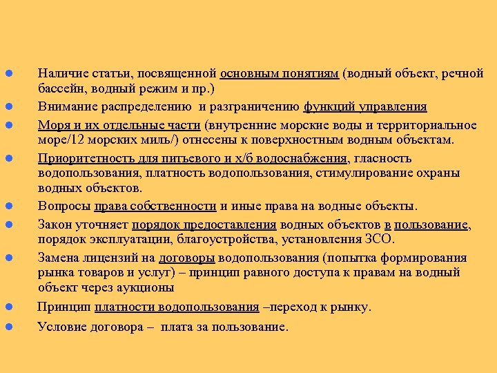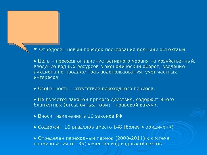 • Определен новый порядок пользования водными объектами • Цель – переход от административного уровня на хозяйственный, введение водных ресурсов в экономический оборот, введение аукциона по продаже прав водопользования, учет частных интересов • Особенность – отсутствие переходного периода. • Не является законом прямого действия, содержит много бланкетных (отсылочных норм) - правовой вакуум. • Вносит изменения в 16 законов РФ • Содержит 16 разделов вместо 148 (более «юридичен» ) • Определен переходный период (2008 -2014) к системе нормирования (ст. 35) качества водных объектов