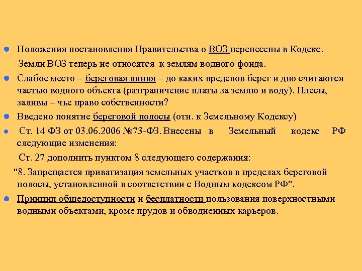 Положения постановления Правительства о ВОЗ перенесены в Кодекс. Земли ВОЗ теперь не относятся к землям водного фонда. l Слабое место – береговая линия – до каких пределов берег и дно считаются частью водного объекта (разграничение платы за землю и воду). Плесы, заливы – чье право собственности? l Введено понятие береговой полосы (отн. к Земельному Кодексу) l Ст. 14 ФЗ от 03. 06. 2006 № 73 -ФЗ. Внесены в Земельный кодекс РФ следующие изменения: Ст. 27 дополнить пунктом 8 следующего содержания: "8. Запрещается приватизация земельных участков в пределах береговой полосы, установленной в соответствии с Водным кодексом РФ". l Принцип общедоступности и бесплатности пользования поверхностными водными объектами, кроме прудов и обводненных карьеров. l 49