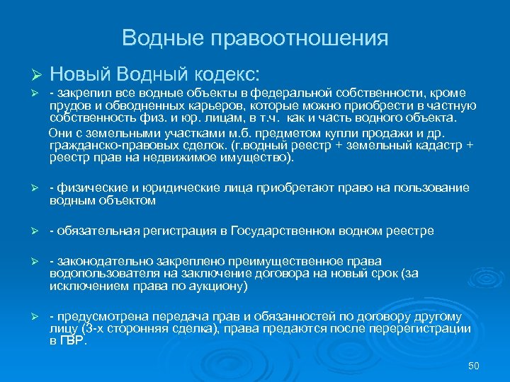 Водные правоотношения Ø Новый Водный кодекс: - закрепил все водные объекты в федеральной собственности, кроме прудов и обводненных карьеров, которые можно приобрести в частную собственность физ. и юр. лицам, в т. ч. как и часть водного объекта. Они с земельными участками м. б. предметом купли продажи и др. гражданско-правовых сделок. (г. водный реестр + земельный кадастр + реестр прав на недвижимое имущество). Ø Ø - физические и юридические лица приобретают право на пользование водным объектом Ø - обязательная регистрация в Государственном водном реестре Ø - законодательно закреплено преимущественное права водопользователя на заключение договора на новый срок (за исключением права по аукциону) Ø - предусмотрена передача прав и обязанностей по договору другому лицу (3 -х сторонняя сделка), права предаются после перерегистрации в ГВР. 50