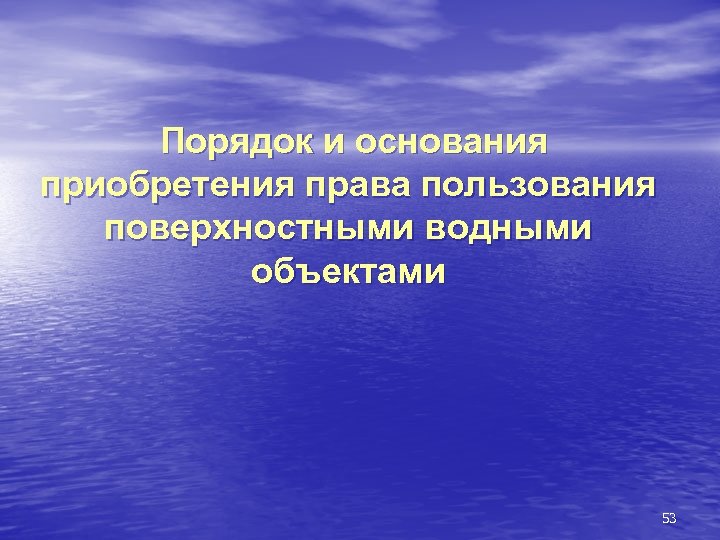 Глава 5. ВОДОПОЛЬЗОВАНИЕ n Статья 37. Цели водопользования Водные объекты используются для целей: n питьевого и хозяйственно-бытового водоснабжения, n сброса сточных вод и (или) дренажных вод, n производства электрической энергии, n водного и воздушного транспорта, n сплава леса n и иных предусмотренных настоящим Кодексом целей. 52