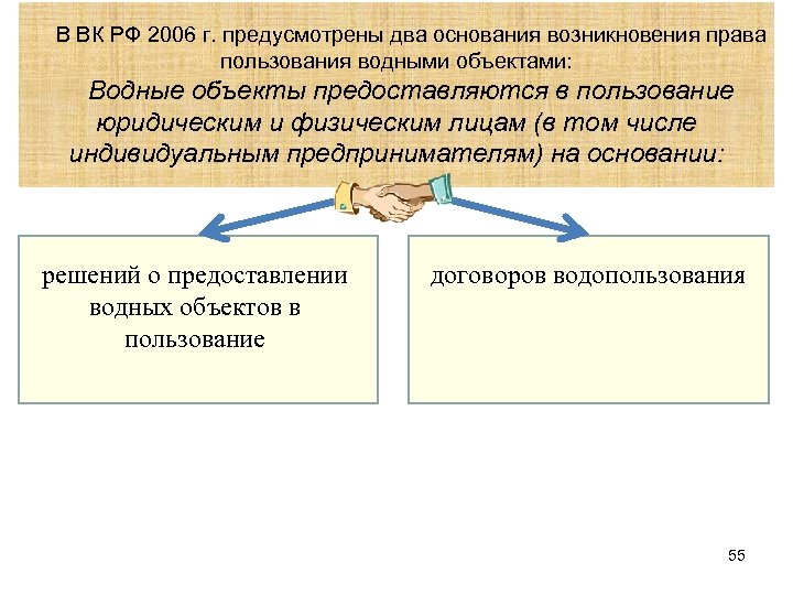 В ВК РФ 2006 г. предусмотрены два основания возникновения права пользования водными объектами: Водные объекты предоставляются в пользование юридическим и физическим лицам (в том числе индивидуальным предпринимателям) на основании: решений о предоставлении водных объектов в пользование договоров водопользования 55