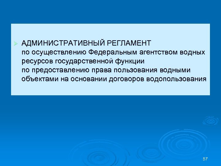 Ø АДМИНИСТРАТИВНЫЙ РЕГЛАМЕНТ по осуществлению Федеральным агентством водных ресурсов государственной функции по предоставлению права пользования водными объектами на основании договоров водопользования 57