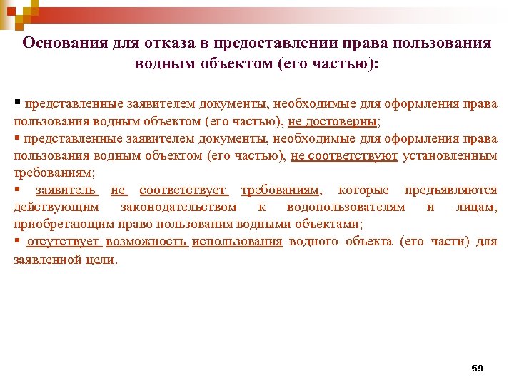 Основания для отказа в предоставлении права пользования водным объектом (его частью): § представленные заявителем документы, необходимые для оформления права пользования водным объектом (его частью), не достоверны; § представленные заявителем документы, необходимые для оформления права пользования водным объектом (его частью), не соответствуют установленным требованиям; § заявитель не соответствует требованиям, которые предъявляются действующим законодательством к водопользователям и лицам, приобретающим право пользования водными объектами; § отсутствует возможность использования водного объекта (его части) для заявленной цели. 59