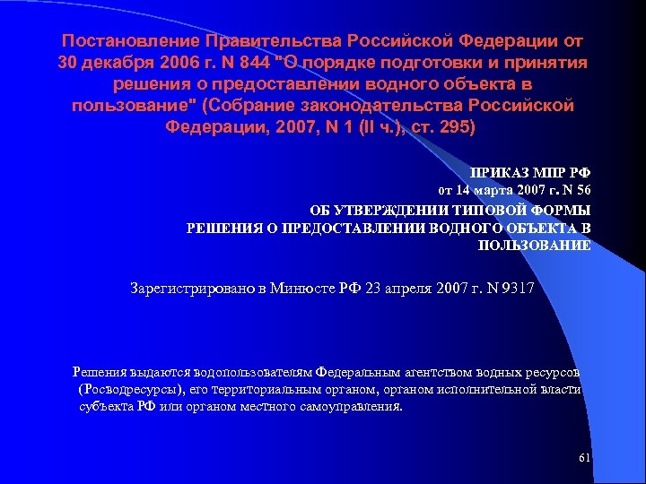 Постановление Правительства Российской Федерации от 30 декабря 2006 г. N 844 "О порядке подготовки и принятия решения о предоставлении водного объекта в пользование" (Собрание законодательства Российской Федерации, 2007, N 1 (II ч. ), ст. 295) ПРИКАЗ МПР РФ от 14 марта 2007 г. N 56 ОБ УТВЕРЖДЕНИИ ТИПОВОЙ ФОРМЫ РЕШЕНИЯ О ПРЕДОСТАВЛЕНИИ ВОДНОГО ОБЪЕКТА В ПОЛЬЗОВАНИЕ Зарегистрировано в Минюсте РФ 23 апреля 2007 г. N 9317 Решения выдаются водопользователям Федеральным агентством водных ресурсов (Росводресурсы), его территориальным органом, органом исполнительной власти субъекта РФ или органом местного самоуправления. 61