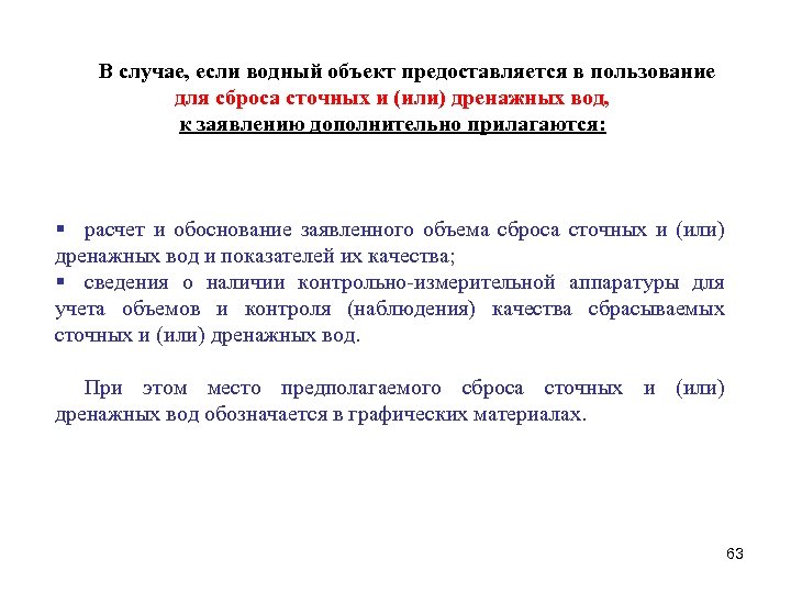 В случае, если водный объект предоставляется в пользование для сброса сточных и (или) дренажных вод, к заявлению дополнительно прилагаются: § расчет и обоснование заявленного объема сброса сточных и (или) дренажных вод и показателей их качества; § сведения о наличии контрольно-измерительной аппаратуры для учета объемов и контроля (наблюдения) качества сбрасываемых сточных и (или) дренажных вод. При этом место предполагаемого сброса сточных и (или) дренажных вод обозначается в графических материалах. 63