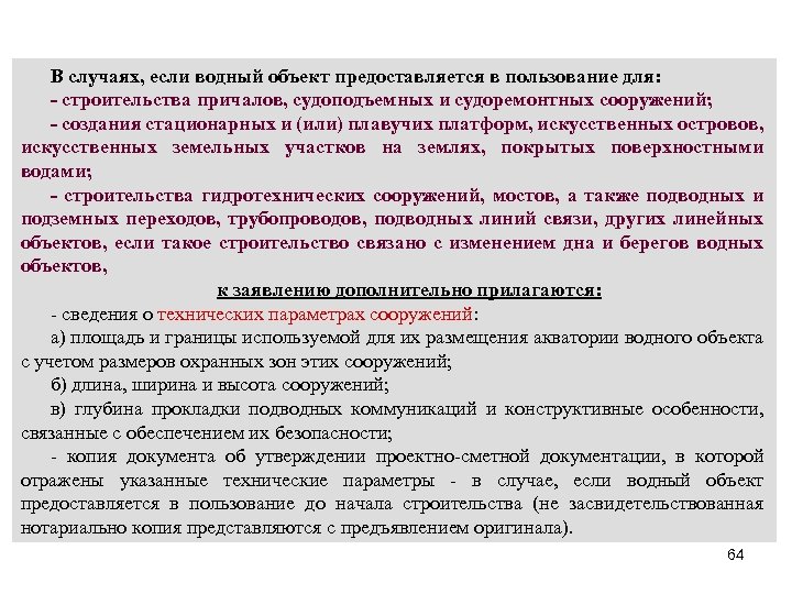 В случаях, если водный объект предоставляется в пользование для: - строительства причалов, судоподъемных и судоремонтных сооружений; - создания стационарных и (или) плавучих платформ, искусственных островов, искусственных земельных участков на землях, покрытых поверхностными водами; - строительства гидротехнических сооружений, мостов, а также подводных и подземных переходов, трубопроводов, подводных линий связи, других линейных объектов, если такое строительство связано с изменением дна и берегов водных объектов, к заявлению дополнительно прилагаются: - сведения о технических параметрах сооружений: а) площадь и границы используемой для их размещения акватории водного объекта с учетом размеров охранных зон этих сооружений; б) длина, ширина и высота сооружений; в) глубина прокладки подводных коммуникаций и конструктивные особенности, связанные с обеспечением их безопасности; - копия документа об утверждении проектно-сметной документации, в которой отражены указанные технические параметры - в случае, если водный объект предоставляется в пользование до начала строительства (не засвидетельствованная нотариально копия представляются с предъявлением оригинала). 64