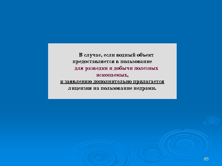 В случае, если водный объект предоставляется в пользование для разведки и добычи полезных ископаемых, к заявлению дополнительно прилагается лицензия на пользование недрами. 65