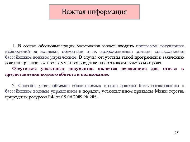 Важная информация 1. В состав обосновывающих материалов может входить программа регулярных наблюдений за водными объектами и их водоохранными зонами, согласованная бассейновым водным управлением. В случае отсутствия такой программы к заявлению должна прилагаться программа производственного экологического контроля. Отсутствие указанных документов является основанием для отказа в предоставлении водного объекта в пользование. 2. Способы учета объемов сбрасываемых стоков должны быть согласованны с бассейновым водным управлением в порядке, установленном приказом Министерства природных ресурсов РФ от 08. 06. 2009 № 205. 67