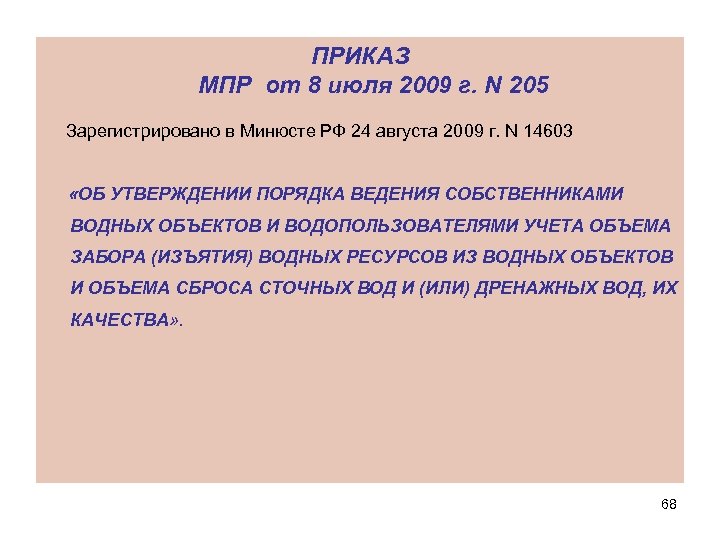 ПРИКАЗ МПР от 8 июля 2009 г. N 205 Зарегистрировано в Минюсте РФ 24 августа 2009 г. N 14603 «ОБ УТВЕРЖДЕНИИ ПОРЯДКА ВЕДЕНИЯ СОБСТВЕННИКАМИ ВОДНЫХ ОБЪЕКТОВ И ВОДОПОЛЬЗОВАТЕЛЯМИ УЧЕТА ОБЪЕМА ЗАБОРА (ИЗЪЯТИЯ) ВОДНЫХ РЕСУРСОВ ИЗ ВОДНЫХ ОБЪЕКТОВ И ОБЪЕМА СБРОСА СТОЧНЫХ ВОД И (ИЛИ) ДРЕНАЖНЫХ ВОД, ИХ КАЧЕСТВА» . 68