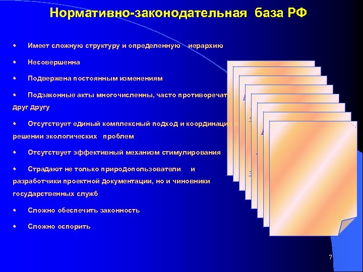 Практически все законы РФ, регулирующие вопросы охраны окружающей среды, являются рамочными (устанавливают общие принципы и направления). Отдельные положения федеральных законов дополняются указами Президента РФ и постановлениями Правительства РФ. n n Во исполнение их разрабатываются нормативно-правовые акты федеральных органов исполнительной власти. n Если нормативные акты противоречат другу, применяют нормативный акт, обладающий наибольшей юридической силой. n Если нормативные правовые акты равны по силе, применяют акт, принятый позднее. n Если противоречат общие и специальные нормативы, применяется норматив, имеющий специальный характер. n Правовые акты субъектов не могут противоречить федеральным. В случае противоречия действует федеральный закон. n n Если федеральный закон противоречит международному договору РФ, то применяются правила международного договора (особенно деятельность на морской акватории, если деятельность не регулируется фз). В случае противоречия между федеральным законом и нормативно-правовым актом субъекта РФ, изданным по предметам ведения субъекта федерации, действует нормативный правовой акт субъекта. 6