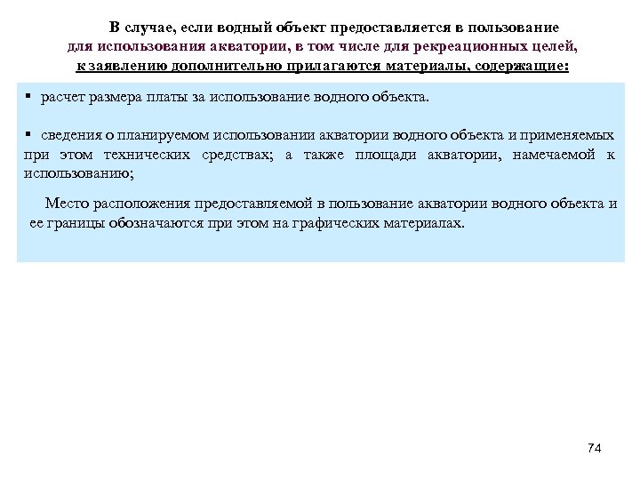 В случае, если водный объект предоставляется в пользование для использования акватории, в том числе для рекреационных целей, к заявлению дополнительно прилагаются материалы, содержащие: § расчет размера платы за использование водного объекта. § сведения о планируемом использовании акватории водного объекта и применяемых при этом технических средствах; а также площади акватории, намечаемой к использованию; Место расположения предоставляемой в пользование акватории водного объекта и ее границы обозначаются при этом на графических материалах. 74