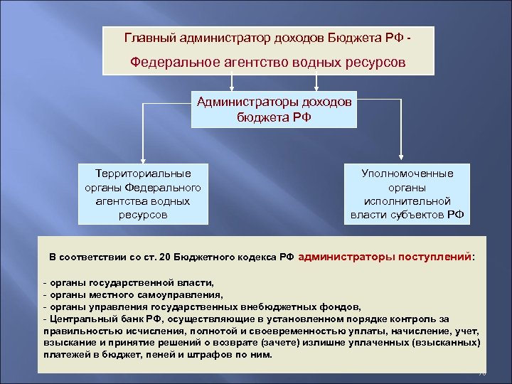 Главный администратор доходов Бюджета РФ - Федеральное агентство водных ресурсов Администраторы доходов бюджета РФ Территориальные органы Федерального агентства водных ресурсов Уполномоченные органы исполнительной власти субъектов РФ В соответствии со ст. 20 Бюджетного кодекса РФ администраторы поступлений: - органы государственной власти, - органы местного самоуправления, - органы управления государственных внебюджетных фондов, - Центральный банк РФ, осуществляющие в установленном порядке контроль за правильностью исчисления, полнотой и своевременностью уплаты, начисление, учет, взыскание и принятие решений о возврате (зачете) излишне уплаченных (взысканных) платежей в бюджет, пеней и штрафов по ним. 78