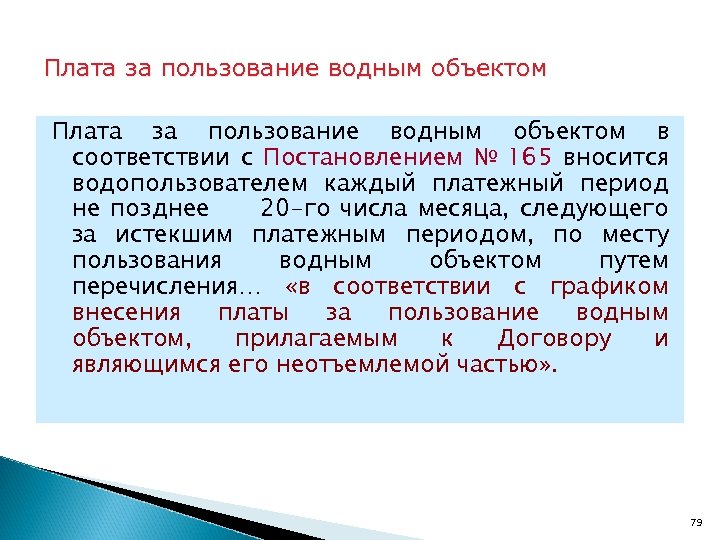 Плата за пользование водным объектом в соответствии с Постановлением № 165 вносится водопользователем каждый платежный период не позднее 20 -го числа месяца, следующего за истекшим платежным периодом, по месту пользования водным объектом путем перечисления… «в соответствии с графиком внесения платы за пользование водным объектом, прилагаемым к Договору и являющимся его неотъемлемой частью» . 79