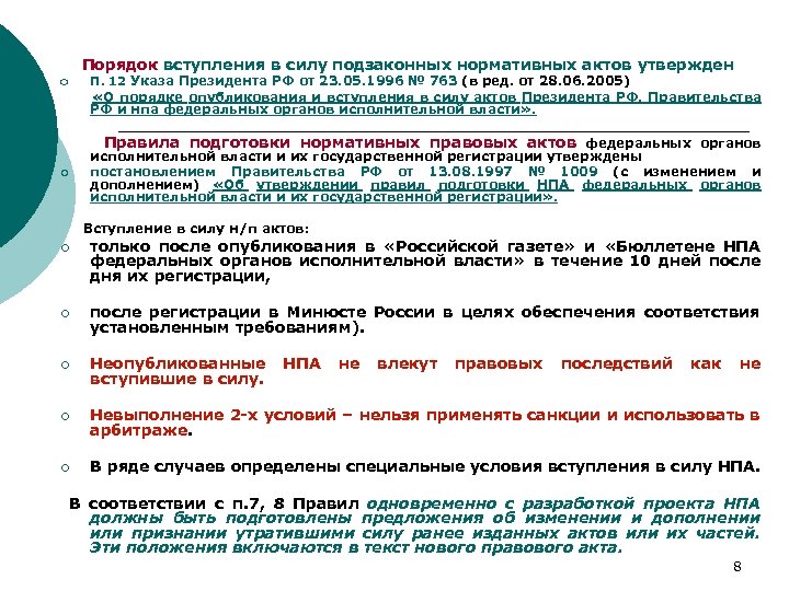 Порядок вступления в силу подзаконных нормативных актов ¡ П. 12 Указа Президента РФ от 23. 05. 1996 № 763 (в ред. от 28. 06. 2005) утвержден «О порядке опубликования и вступления в силу актов Президента РФ, Правительства РФ и нпа федеральных органов исполнительной власти» . ¡ Правила подготовки нормативных правовых актов федеральных органов исполнительной власти и их государственной регистрации утверждены постановлением Правительства РФ от 13. 08. 1997 № 1009 (с изменением и дополнением) «Об утверждении правил подготовки НПА федеральных органов исполнительной власти и их государственной регистрации» . Вступление в силу н/п актов: ¡ только после опубликования в «Российской газете» и «Бюллетене НПА федеральных органов исполнительной власти» в течение 10 дней после дня их регистрации, ¡ после регистрации в Минюсте России в целях обеспечения соответствия установленным требованиям). ¡ Неопубликованные вступившие в силу. ¡ Невыполнение 2 -х условий – нельзя применять санкции и использовать в арбитраже. ¡ В ряде случаев определены специальные условия вступления в силу НПА не влекут правовых последствий как не В соответствии с п. 7, 8 Правил одновременно с разработкой проекта НПА должны быть подготовлены предложения об изменении и дополнении или признании утратившими силу ранее изданных актов или их частей. Эти положения включаются в текст нового правового акта. 8