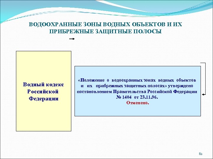 ВОДООХРАННЫЕ ЗОНЫ ВОДНЫХ ОБЪЕКТОВ И ИХ ПРИБРЕЖНЫЕ ЗАЩИТНЫЕ ПОЛОСЫ Водный кодекс Российской Федерации «Положение о водоохранных зонах водных объектов и их прибрежных защитных полосах» утверждено постановлением Правительства Российской Федерации № 1404 от 23. 11. 96. Отменено. 82