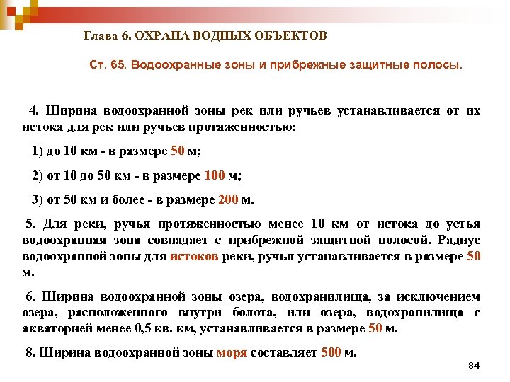 Глава 6. ОХРАНА ВОДНЫХ ОБЪЕКТОВ Ст. 65. Водоохранные зоны и прибрежные защитные полосы. 4. Ширина водоохранной зоны рек или ручьев устанавливается от их истока для рек или ручьев протяженностью: 1) до 10 км - в размере 50 м; 2) от 10 до 50 км - в размере 100 м; 3) от 50 км и более - в размере 200 м. 5. Для реки, ручья протяженностью менее 10 км от истока до устья водоохранная зона совпадает с прибрежной защитной полосой. Радиус водоохранной зоны для истоков реки, ручья устанавливается в размере 50 м. 6. Ширина водоохранной зоны озера, водохранилища, за исключением озера, расположенного внутри болота, или озера, водохранилища с акваторией менее 0, 5 кв. км, устанавливается в размере 50 м. 8. Ширина водоохранной зоны моря составляет 500 м. 84
