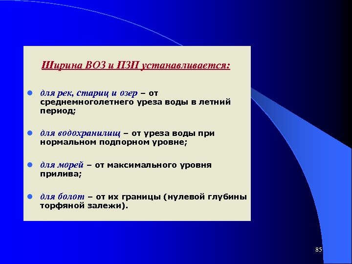 Ширина ВОЗ и ПЗП устанавливается: l для рек, стариц и озер – от l для водохранилищ – от уреза воды при l для морей – от максимального уровня l для болот – от их границы (нулевой глубины среднемноголетнего уреза воды в летний период; нормальном подпорном уровне; прилива; торфяной залежи). 85