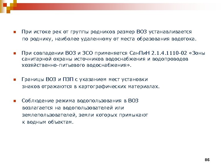 При истоке рек от группы родников размер ВОЗ устанавливается по роднику, наиболее удаленному от места образования водотока. n n При совпадении ВОЗ и ЗСО применяется Сан. Пи. Н 2. 1. 4. 1110 -02 «Зоны санитарной охраны источников водоснабжения и водопроводов хозяйственно-питьевого водоснабжения» . Границы ВОЗ и ПЗП с указанием мест установки знаков отражаются в картографических материалах. n Соблюдение режима водопользования в ВОЗ возлагается на водопользователей или землепользователей, земли которых примыкают к водным объектам. n 86