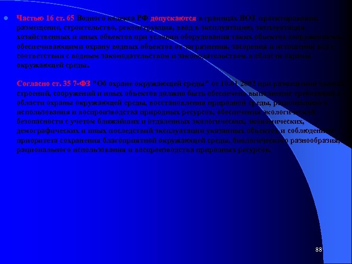 l Частью 16 ст. 65 Водного кодекса РФ допускаются в границах ВОЗ проектирование, размещение, строительство, реконструкция, ввод в эксплуатацию, эксплуатация хозяйственных и иных объектов при условии оборудования таких объектов сооружениями, обеспечивающими охрану водных объектов от загрязнения, засорения и истощения вод в соответствии с водным законодательством и законодательством в области охраны окружающей среды. Согласно ст. 35 7 -ФЗ "Об охране окружающей среды" от 10. 01 2002 при размещении зданий, строений, сооружений и иных объектов должно быть обеспечено выполнение требований в области охраны окружающей среды, восстановления природной среды, рационального использования и воспроизводства природных ресурсов, обеспечения экологической безопасности с учетом ближайших и отдаленных экологических, экономических, демографических и иных последствий эксплуатации указанных объектов и соблюдением приоритета сохранения благоприятной окружающей среды, биологического разнообразия, рационального использования и воспроизводства природных ресурсов. 88