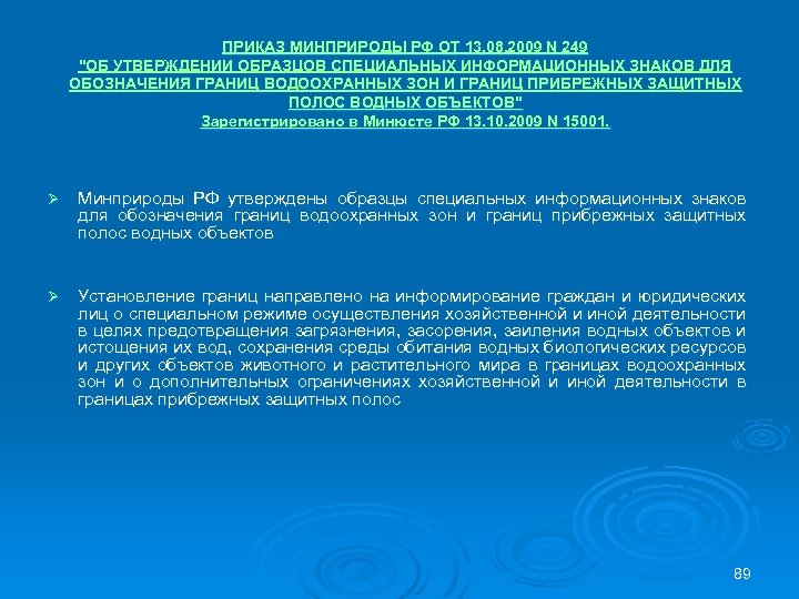 ПРИКАЗ МИНПРИРОДЫ РФ ОТ 13. 08. 2009 N 249 "ОБ УТВЕРЖДЕНИИ ОБРАЗЦОВ СПЕЦИАЛЬНЫХ ИНФОРМАЦИОННЫХ ЗНАКОВ ДЛЯ ОБОЗНАЧЕНИЯ ГРАНИЦ ВОДООХРАННЫХ ЗОН И ГРАНИЦ ПРИБРЕЖНЫХ ЗАЩИТНЫХ ПОЛОС ВОДНЫХ ОБЪЕКТОВ" Зарегистрировано в Минюсте РФ 13. 10. 2009 N 15001. Ø Минприроды РФ утверждены образцы специальных информационных знаков для обозначения границ водоохранных зон и границ прибрежных защитных полос водных объектов Ø Установление границ направлено на информирование граждан и юридических лиц о специальном режиме осуществления хозяйственной и иной деятельности в целях предотвращения загрязнения, засорения, заиления водных объектов и истощения их вод, сохранения среды обитания водных биологических ресурсов и других объектов животного и растительного мира в границах водоохранных зон и о дополнительных ограничениях хозяйственной и иной деятельности в границах прибрежных защитных полос 89