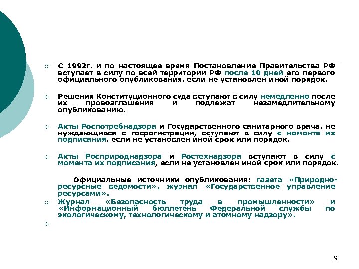 ¡ С 1992 г. и по настоящее время Постановление Правительства РФ вступает в силу по всей территории РФ после 10 дней его первого официального опубликования, если не установлен иной порядок. ¡ Решения Конституционного суда вступают в силу немедленно после их провозглашения и подлежат незамедлительному опубликованию. ¡ Акты Роспотребнадзора и Государственного санитарного врача, не нуждающиеся в госрегистрации, вступают в силу с момента их подписания, если не установлен иной срок или порядок. ¡ Акты Росприроднадзора и Ростехнадзора вступают в силу с момента их подписания, если не установлен иной срок или порядок. ¡ Официальные источники опубликования: газета «Природноресурсные ведомости» , журнал «Государственное управление ресурсами» . Журнал «Безопасность труда в промышленности» и «Информационный бюллетень Федеральной службы по экологическому, технологическому и атомному надзору» . ¡ 9