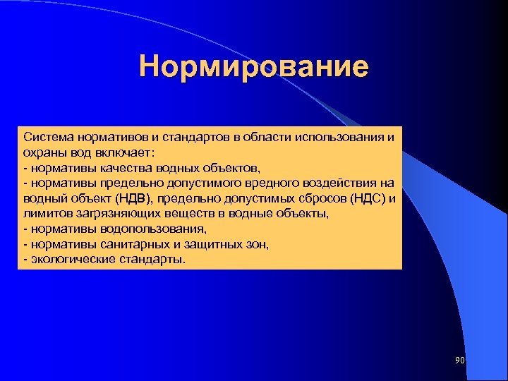 Нормирование Система нормативов и стандартов в области использования и охраны вод включает: - нормативы качества водных объектов, - нормативы предельно допустимого вредного воздействия на водный объект (НДВ), предельно допустимых сбросов (НДС) и лимитов загрязняющих веществ в водные объекты, - нормативы водопользования, - нормативы санитарных и защитных зон, - экологические стандарты. 90