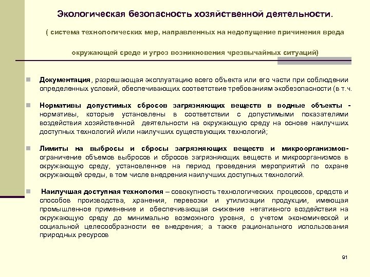 Экологическая безопасность хозяйственной деятельности. ( система технологических мер, направленных на недопущение причинения вреда окружающей среде и угроз возникновения чрезвычайных ситуаций) n Документация, разрешающая эксплуатацию всего объекта или его части при соблюдении определенных условий, обеспечивающих соответствие требованиям экобезопасности (в т. ч. n Нормативы допустимых сбросов загрязняющих веществ в водные объекты нормативы, которые установлены в соответствии с допустимыми показателями воздействия хозяйственной деятельности на окружающую среду на основе наилучших доступных технологий и/или наилучших существующих технологий; n Лимиты на выбросы и сбросы загрязняющих веществ и микроорганизмов- ограничение объемов выбросов и сбросов загрязняющих веществ и микроорганизмов в окружающую среду, установленное на период проведения мероприятий по охране окружающей среды, в том числе внедрения наилучших доступных технологий. n Наилучшая доступная технология – совокупность технологических процессов, средств и способов производства, хранения, перевозки и утилизации продукции, имеющая промышленное применение и обеспечивающая снижение негативного воздействия на окружающую среду до минимально возможного уровня, с учетом экономической и социальной целесообразности ее внедрения; а также рационального использования природных ресурсов 91