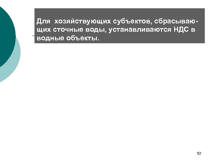 Для хозяйствующих субъектов, сбрасывающих сточные воды, устанавливаются НДС в водные объекты. 92