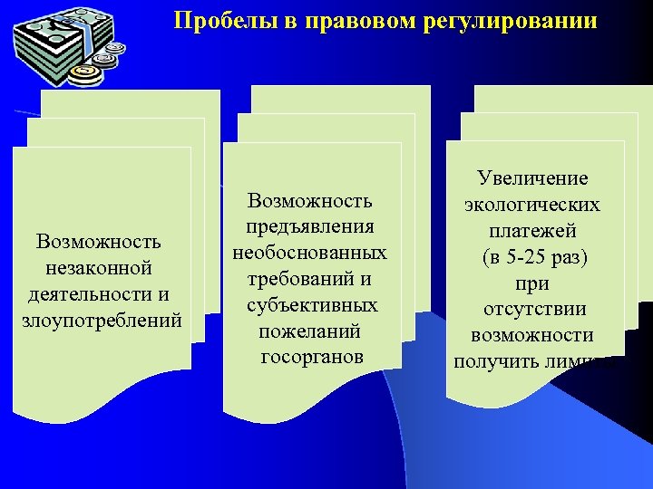 Пробелы в правовом регулировании Возможность незаконной деятельности и злоупотреблений Возможность предъявления необоснованных требований и субъективных пожеланий госорганов Увеличение экологических платежей (в 5 -25 раз) при отсутствии возможности получить лимиты