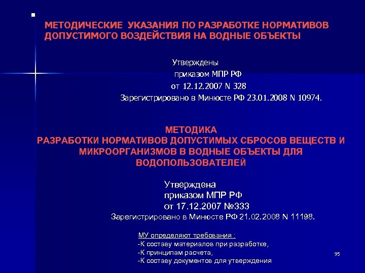 n МЕТОДИЧЕСКИЕ УКАЗАНИЯ ПО РАЗРАБОТКЕ НОРМАТИВОВ ДОПУСТИМОГО ВОЗДЕЙСТВИЯ НА ВОДНЫЕ ОБЪЕКТЫ Утверждены приказом МПР РФ от 12. 2007 N 328 Зарегистрировано в Минюсте РФ 23. 01. 2008 N 10974. МЕТОДИКА РАЗРАБОТКИ НОРМАТИВОВ ДОПУСТИМЫХ СБРОСОВ ВЕЩЕСТВ И МИКРООРГАНИЗМОВ В ВОДНЫЕ ОБЪЕКТЫ ДЛЯ ВОДОПОЛЬЗОВАТЕЛЕЙ Утверждена приказом МПР РФ от 17. 12. 2007 № 333 Зарегистрировано в Минюсте РФ 21. 02. 2008 N 11198. МУ определяют требования : -К составу материалов при разработке, -К принципам расчета, -К составу документов для утверждения 95